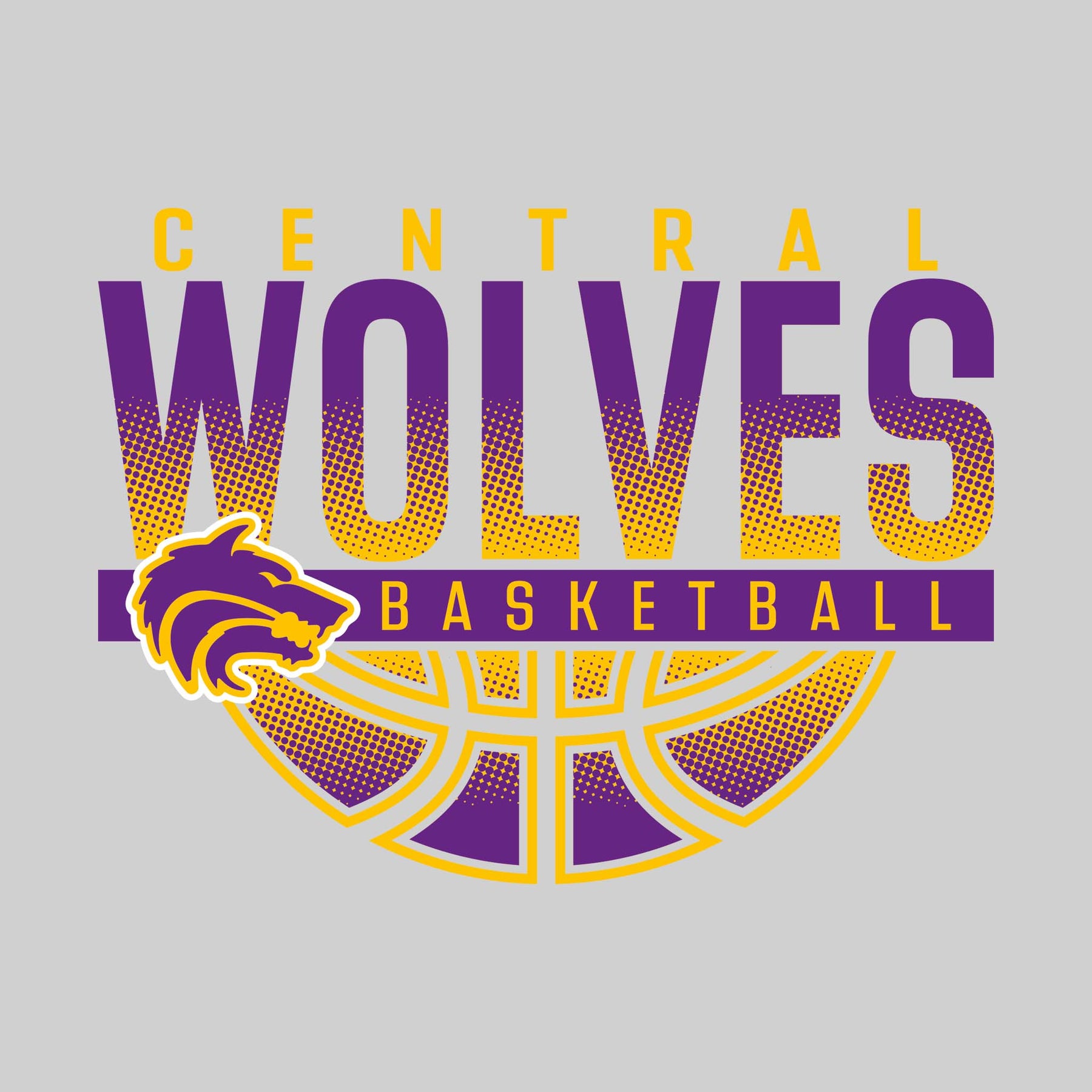 Central Wolves - Basketball - Halftone Wolves Over Basketball with Mascot